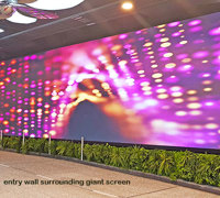 Huge screen in apartment entrance is surrounded by artificial fern walls.