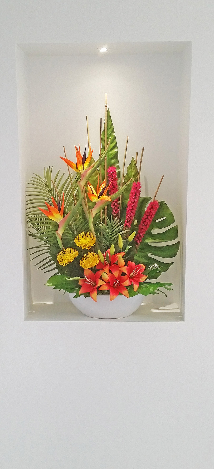 This vibrant artificial floral features Bird-o-Paradise, Oriental lilies, Liatris & Pin-cushions in a lush nest of tropical greenery. Perfect addition to a room