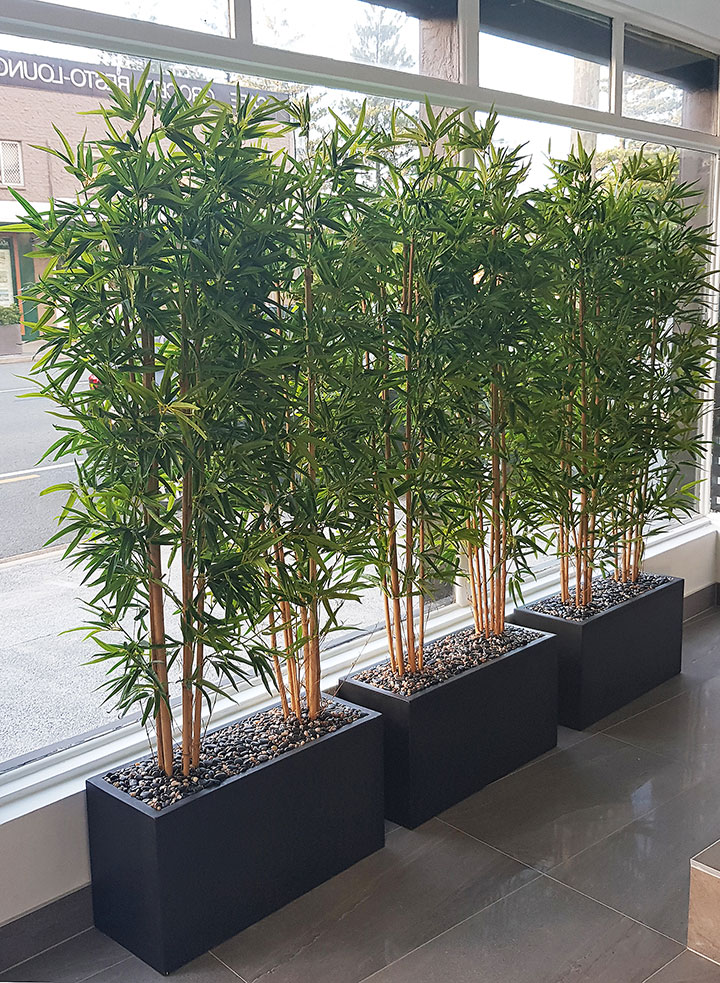 -they chose well, combining our 1.8m 'thai gold' bamboo in a black trough planter finished with a black/brown/gold mottled blend of pebbles, which picked up the colours in planter & natural bamboo stem nicely