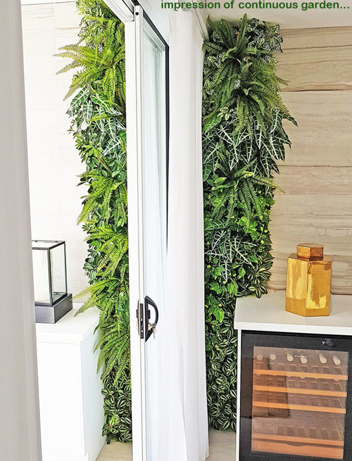 -Fiddle-Leaf Ficus were extended, extra branches added to fan out from corners, Mini-Umbrellas were shortened, bushied-up & tweaked. Ferns were paired, shaped & moulded to fit shapes & planters & a green-wall was made to appear as if it grew straight thru a window!