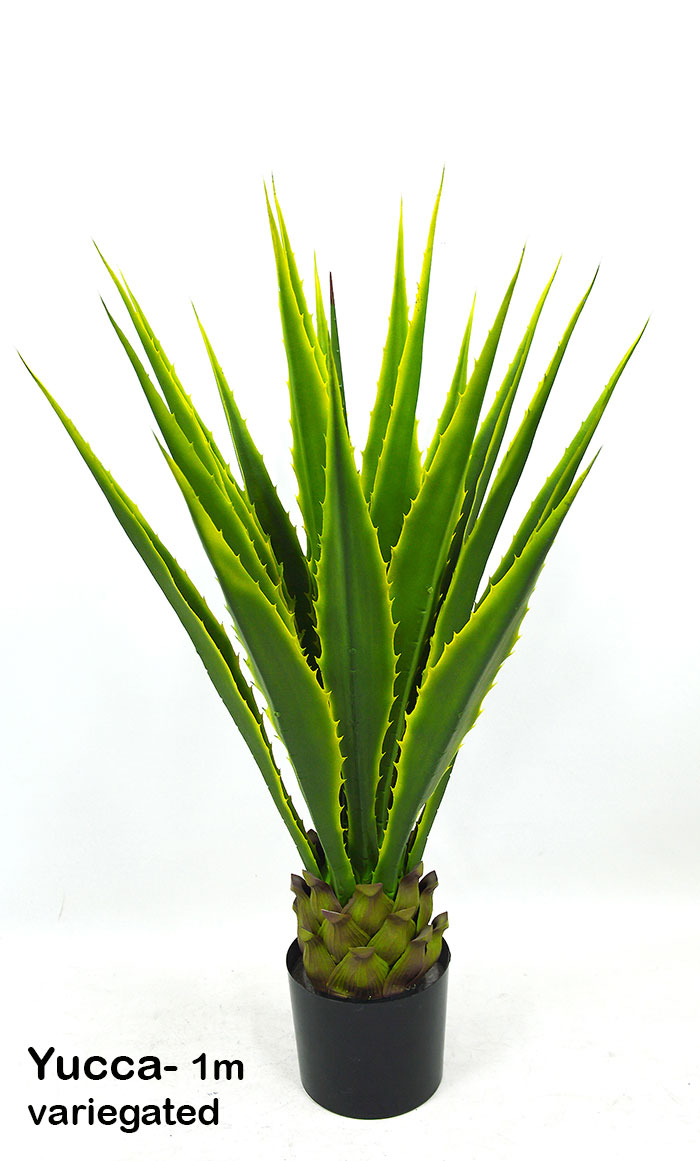 A lifelike Yucca with lovely variegated stripe on foliage is made using the latest materials. It has thorns & spikes that look like the real thing but are soft.