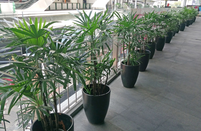 Large Rhapis Palm troughs dress up foyer, avilable in different heights & trough colours.