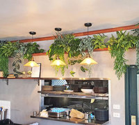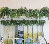 Trailing ass greenery was solution for existing ceiling voids in restaurant after reno.