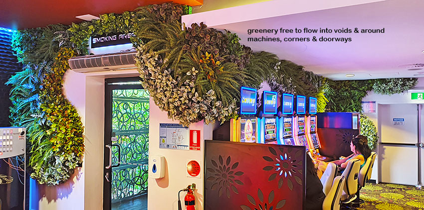 Artificial green-walls can be custom-made to size & shape, here greenery curves around door, corners & gaming machines.