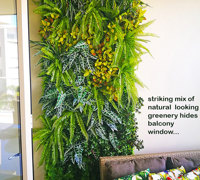 Lush green-wall on balcony, custom fitted around large mirror for stunning effects