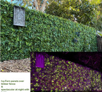 Add lights to your greren-walls for spectacular night displays. Here an old timber fence is transformed by Ivy/Fern panels with lighting.