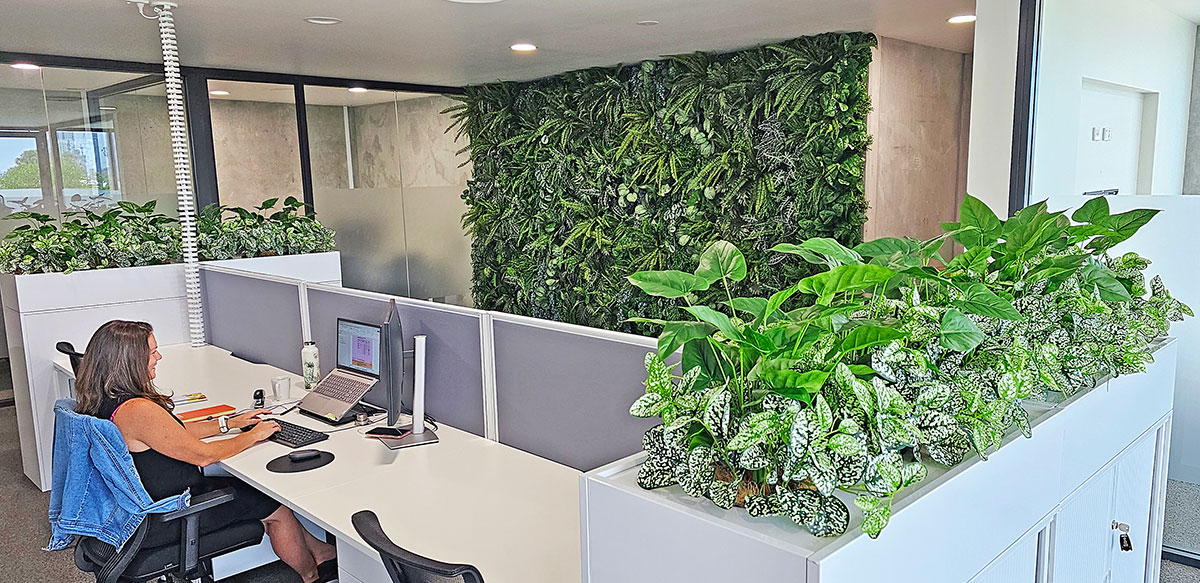 Low greenery dividers help define spaces in an open office without blocking or closing off areas.