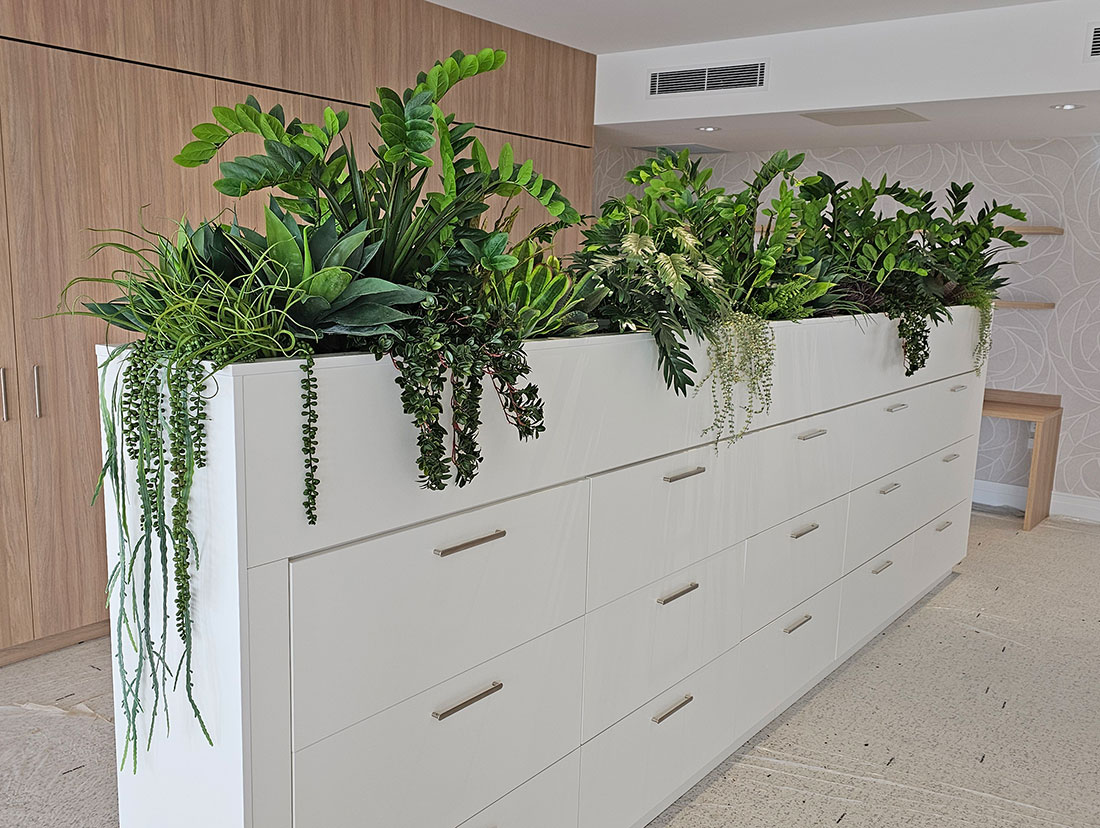 There are many tambour type planters available to sit on top of filing cabinets, use low maintenance artificial plants for striking low-cost effects.