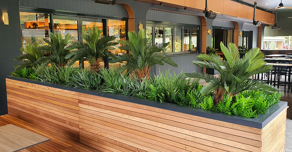 Versatile trough planters can be easily moved to create private function areas with attractive green-feel.