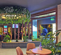 Club bistro is lifted by assorted trailing greenery above servery & continued onto blank wall shelf behind.