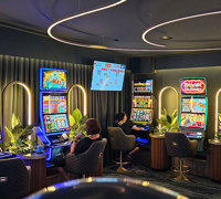 Club Gaming Area refurbed with lots of greenery in planters, between machines & even around lights in ceiling.