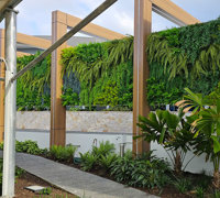 An untidy rear wall given a fresh green feel with matching on columns. Greenery has been custom installed around air-con ducts.