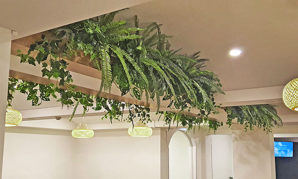Trailing ass greenery was solution for existing ceiling voids in restaurant after reno.