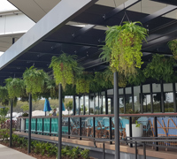 Large mixed-fern baskets 'look great'break-up' a huge ceiling in Club Dining area.