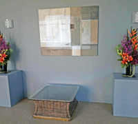 We used a theme of tall stained bamboo-poles for height, strength & continuity. In two existing large round urns in foyer, we added Yuccas, Ferns & Succulents with tropical Flowers for a splash of colour.