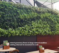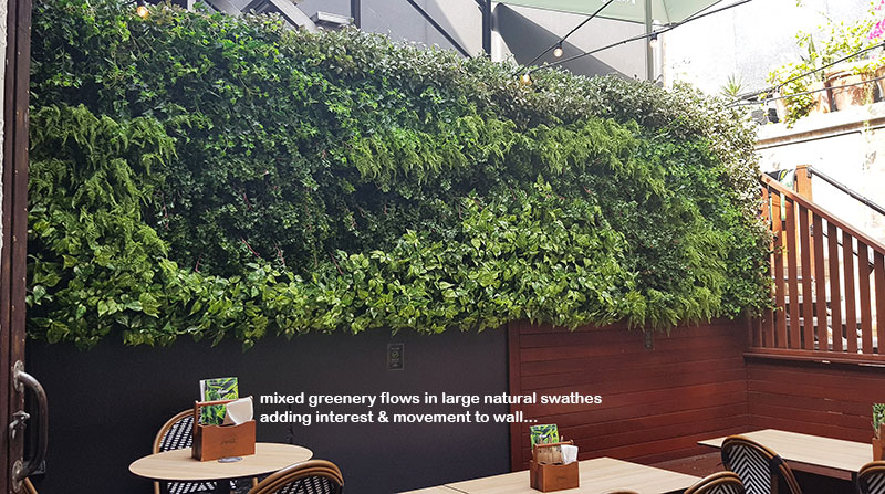 -we suggested an artificial green-wall stretching across & firmly attached to this miss-mash wall. We were able to assist with design & install a green-wall in a clean sweep of lush greenery that completely covered what was underneath.