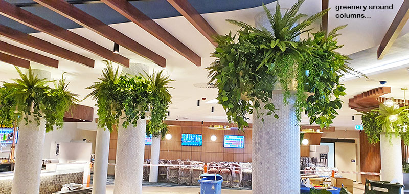 A large Football club was undergoing a fabulous refurb, starting with Entrance, Cafe, Dining & Gaming rooms. The Architects had designed an impressive area with flowing timber garden beds & perched planters on columns, it just needed the right greenery to finish off.