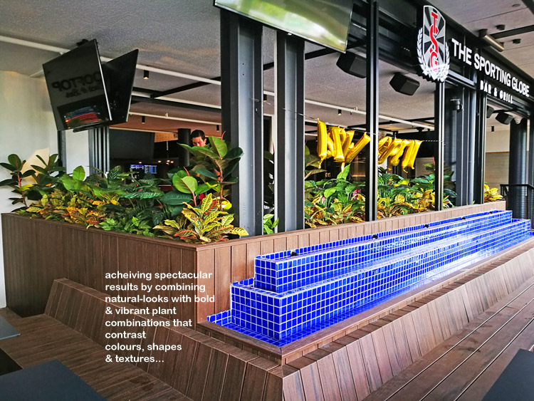 Modern Sports Bar required a complete fit-out of low-maintenance artificial plants, encompassing built-in planter-boxes, green-walls & stand-alone feature floor planters.